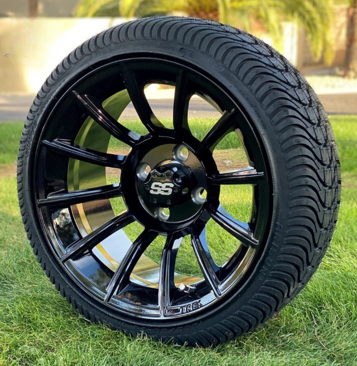 The TITAN Gloss Black Aluminum wheels will give your golf cart that totally custom and sporty look, and breathe new life into your cart! Built to withstand the test of the elements, and easy to clean! We wrap up the wheels in 205/30-14″ Low Profile DOT approved and turf safe tires for a winning combination on the streets and the golf course.