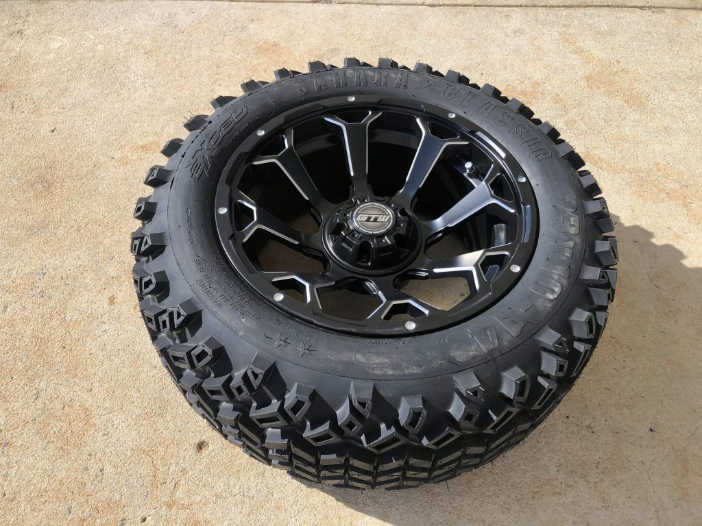 The 14-inch GTW Raven wheels paired with 23×10-14 Sahara Classic all-terrain tires are a popular choice for golf cart enthusiasts seeking enhanced performance and aesthetics. These wheels and tires are designed to provide improved off-road capabilities and a rugged appearance.(Extreme Kartz)
