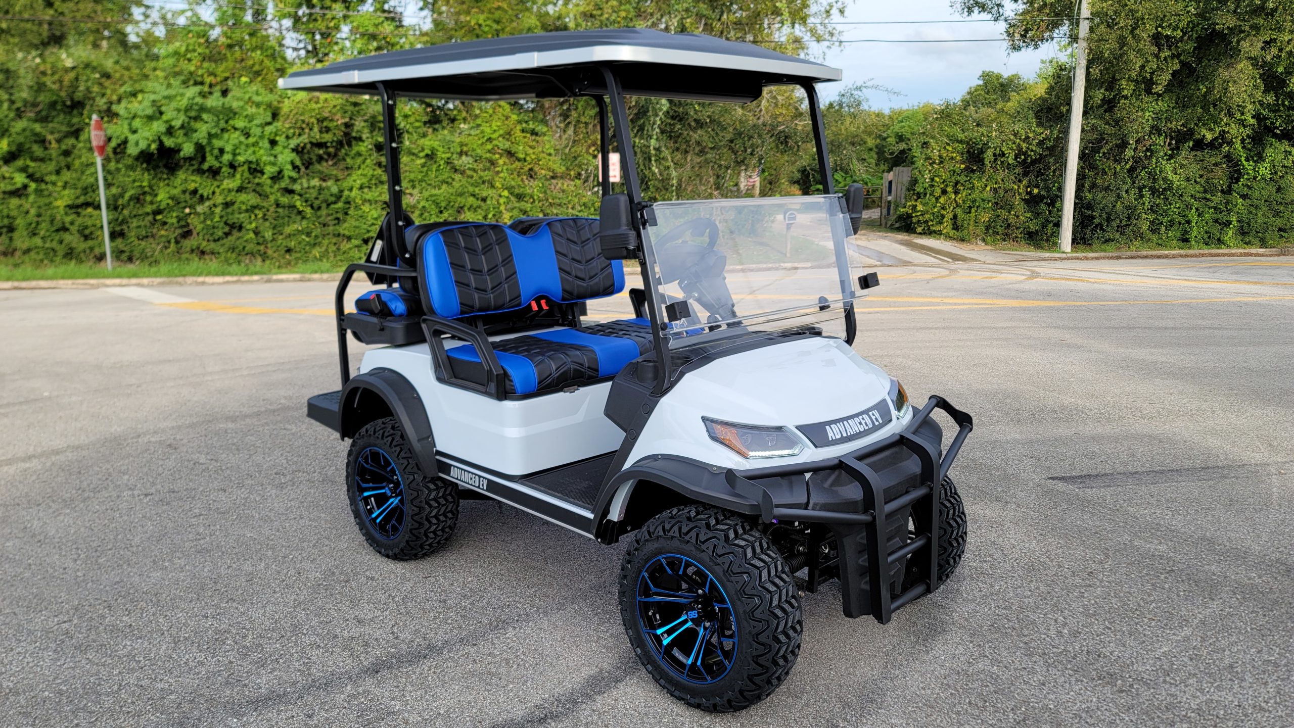 Brand New Special Edition Chalk White Metallic 2022 Advanced EV 2+2 four-passenger lifted golf cart and neighborhood cruiser. 48 volt AC drive with new Trojan Batteries, Curtis 350 amp AC controller & 4kW 5.5 hp motor, onboard charging system, powder-coated frame and chassis, 4-wheel coil spring over shock suspension, black long top with grab handles, rear flip seat with safety/grab bar and can add swinging cup holders. Ultimate LED Light Kit (includes headlights, taillights, brake lights, tum signals, emergency flashers, and a horn), digital speedometer, digital odometer, digital state of charge meter, dual USB outlets, side-mounted rearview mirrors, custom black and blue stitched seat upholstery, (4) retractable seat belts, 48 to 12-volt reducer, custom 14″ black and Blue GTW Spyder Wheels with 23″ Predator All-terrain Tires, fender flares, brush guard bumper, folding windshield, Wetsounds Stealth 10 Ultra HD paired with a Wetsounds AS-8 powered subwoofer, Wetsounds underbody RGB lights and SMV sign. This cart comes with a limited 2-year warranty!